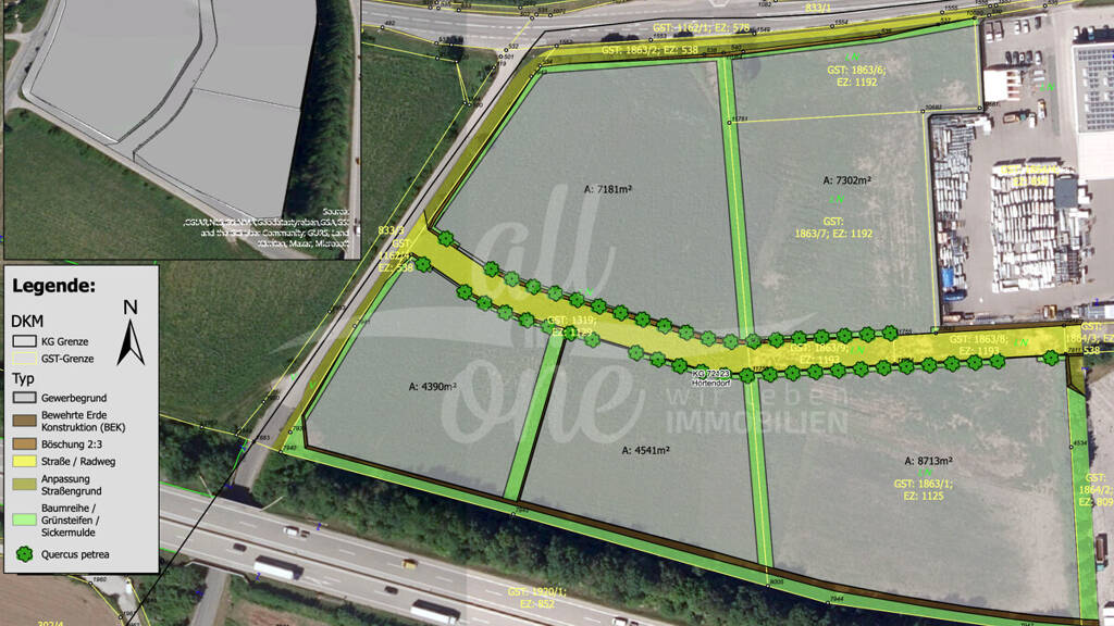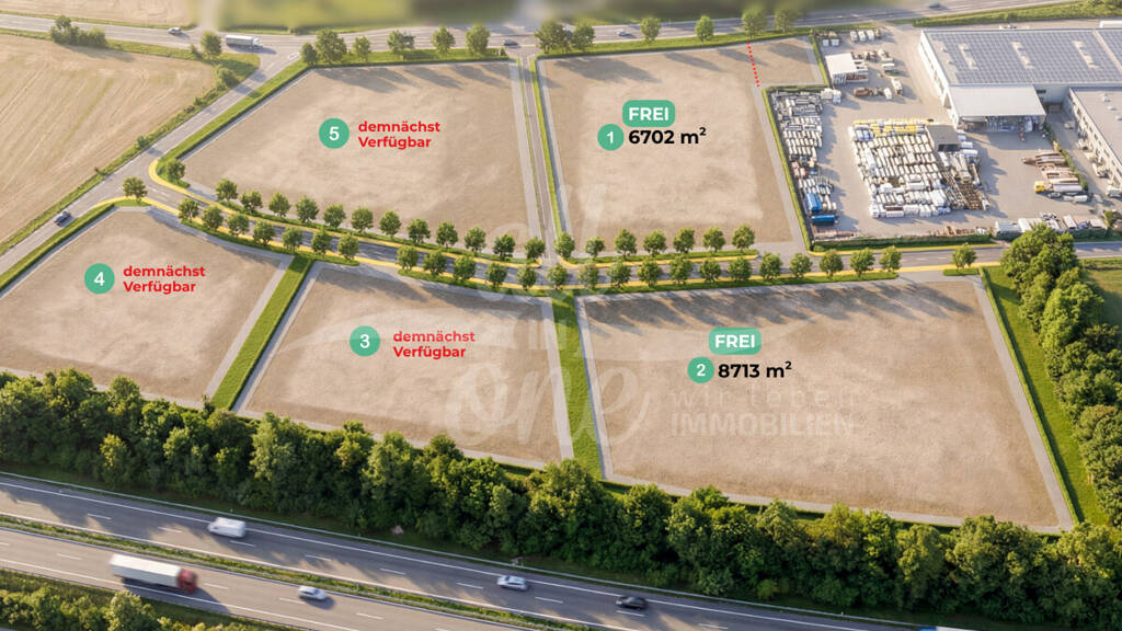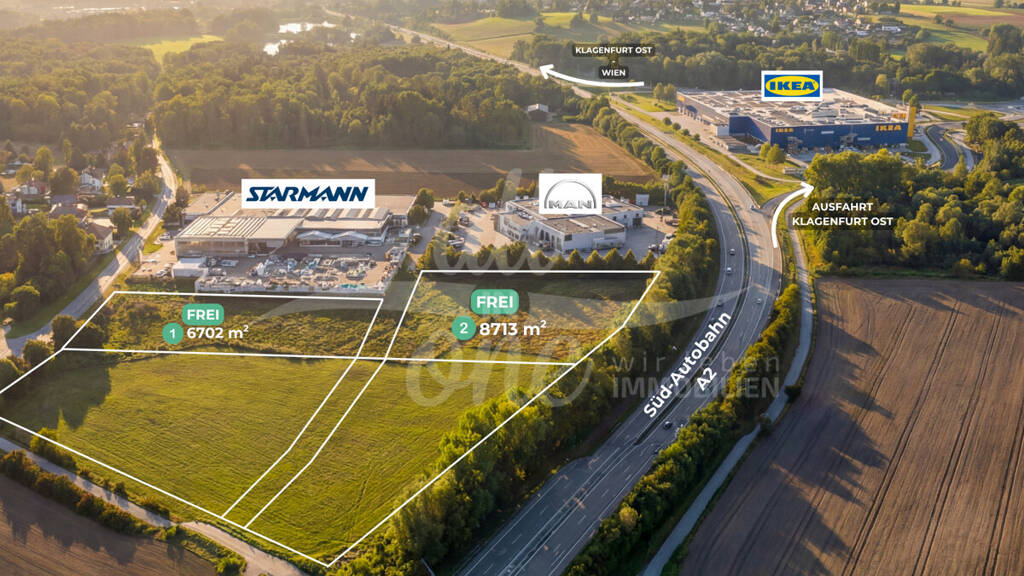 Zur Verpachtung stehen zwei Gewerbegrundstücke in ausgezeichneter Verkehrslage im Osten von Klagenfurt. Der Standort überzeugt durch die unmittelbare Nähe zur A2 Südautobahn sowie zur Auf- und Abfahrt Klagenfurt Ost, wodurch eine sehr gute Erreichbarkeit für Kunden, Mitarbeiter, Lieferverkehr und Logistik gegeben ist.