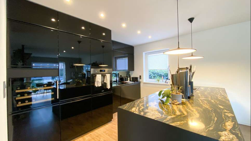 * Offener Wohn- und Essbereich mit hochwertiger Einbauküche mit Insel