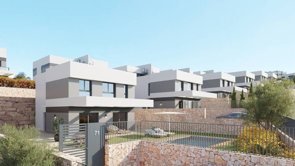 Ein brandneues Projekt, bestehend aus 8 Doppelhaushälften mit 3 Schlafzimmern und 2,5 Bädern und 7 freistehenden Villen mit 4 Schlafzimmern und 2,5 Bädern in Balcon de Finestrat (Alicante), in einer ruhigen, gut vernetzten Gegend in der Nähe von Benidorm, Stränden und dem Golfplatz Puig Campana.
