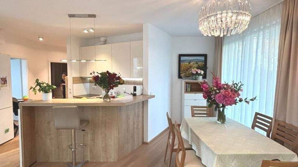 Die Wohnung verfügt über ein großes Wohnzimmer mit einem Küchenbereich, 2 Schlafzimmer, Badezimmer und WC. Die Terrasse ist ideal für gemütliche Abende im Freien und der Garten bietet Platz zum Entspannen und Spielen.