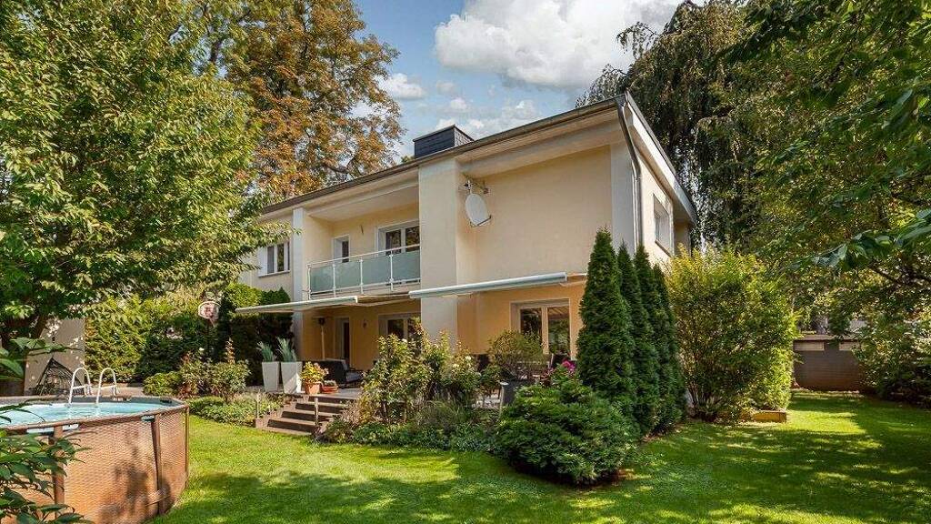 Das 941 m² große, nach Südwesten ausgerichtete Grundstück verfügt über einen liebevoll angelegten Garten mit Pool, Terrasse und Außenkamin - ideal für gesellige Stunden. Im Erdgeschoss befinden sich neben der modernen Küche und dem Esszimmer das großzügige Wohnzimmer mit Kamin und Zugang zur Hauptterrasse, ein Schlafzimmer sowie ein Bad mit Dusche + freistehende Wanne. Die bodentiefen Fenster bieten viel Licht und einen Blick in den Garten. Im Obergeschoss befinden sich 3,5 Zimmer, eines mit Balkon, sowie ein Ankleidezimmer und ein Duschbad. Ein separater Bereich mit Schlafzimmer und eigenem Bad eignet sich hervorragend für den abgetrennten Elternbereich, Gäste oder Au-pair. Im Souterrain findet sich der wohnliche Stil wieder, das neben zwei großen Hobbyräumen, einer Sauna und einem Ruheraum,