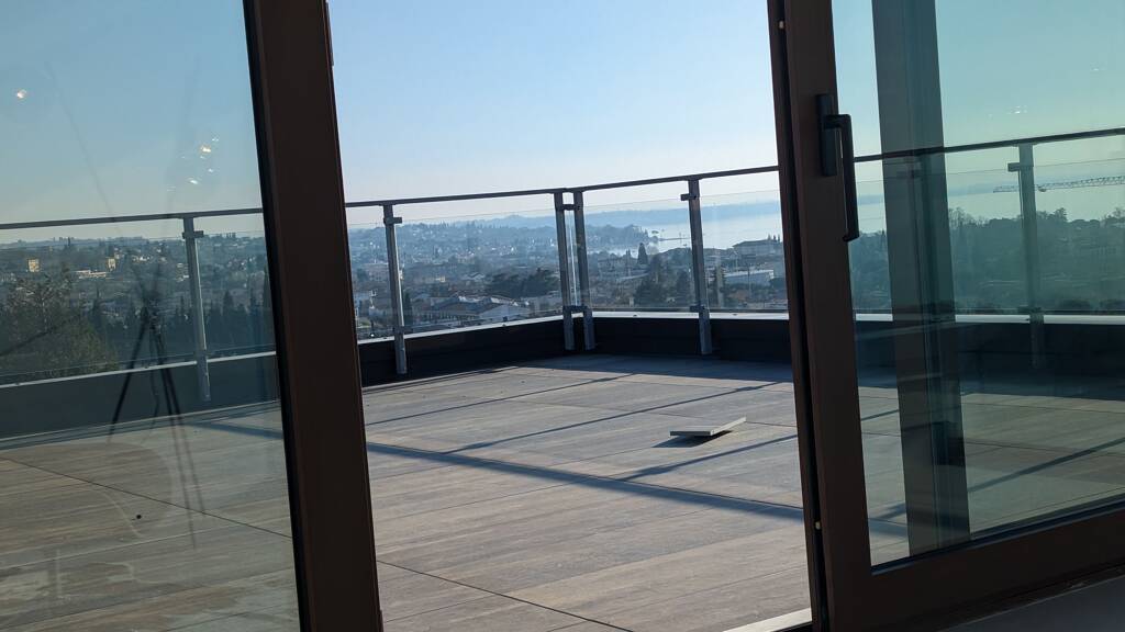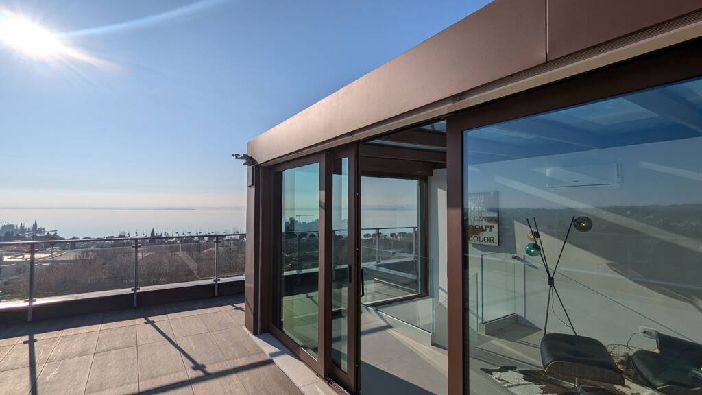 Von der Terrasse haben Sie einen Panoramablick auf den Gardasee und zur Altstadt von Bardolino sowie in Richtung Osten auf die Weinberge von Bardolino. Highlight ist aber die Dachterrasse mit einem Pavillon, z.B. für eine Tee- oder Aussenküche. Der Pavillon lässt sich komplett elektrisch öffnen. Auf der Dachterrasse sind die Anschlüsse für einen Jacuzzi bereits vorhanden und sie ist rundum mit Glasbalkonen abgesichert.