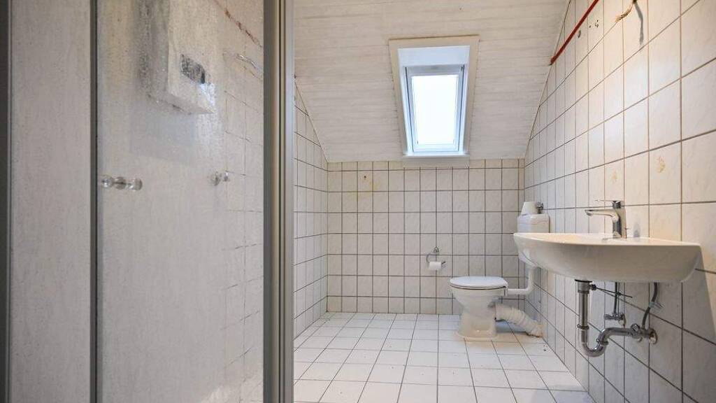 Das Tageslichtbad ist mit einer Dusche, einem WC und einem Waschtisch ausgestattet. Helle Fliesen sorgen hier für ein freundliches und zeitloses Erscheinungsbild.