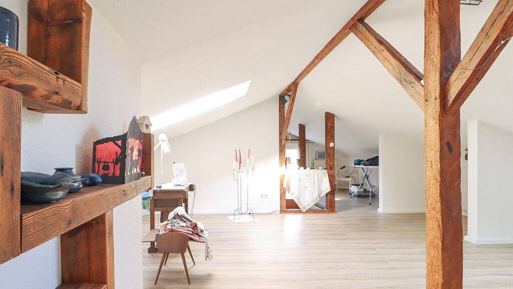Ein besonderes Highlight ist das ausgebaute Dachgeschoss mit sichtbaren Holzbalken, das zusätzlichen Raum für kreative Wohnideen bietet. Auch ein separates Schlafzimmer ist dort untergebracht.