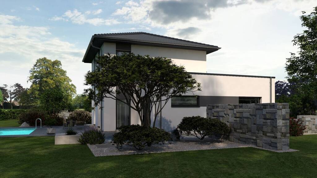 Die quadratische Walmdachvilla wird mit einem Eckanbau optisch und räumlich ergänzt. Der geschützte Eingangsbereich mit Windfang führt in die Diele. Von hier geht es in den offenen Wohn- und Essbereich mit halboffener Küche, von der ein direkter Zugang zum Außenbereich möglich ist. Außerdem befinden sich der ausgelagerte Elternbereich mit Ankleide und eigenem Duschbad sowie Hauswirtschaftsraum und Gäste-WC im Erdgeschoss. Die halbgewendelte Treppe führt in die obere Etage, wo sich eine kleine Galerie befindet. Hier haben die Kinder ihr eigenes Reich. Zwei identisch gespiegelte Zimmer sowie das geräumige Badezimmer sorgen dafür, dass der Nachwuchs sich ungestört entfalten kann.