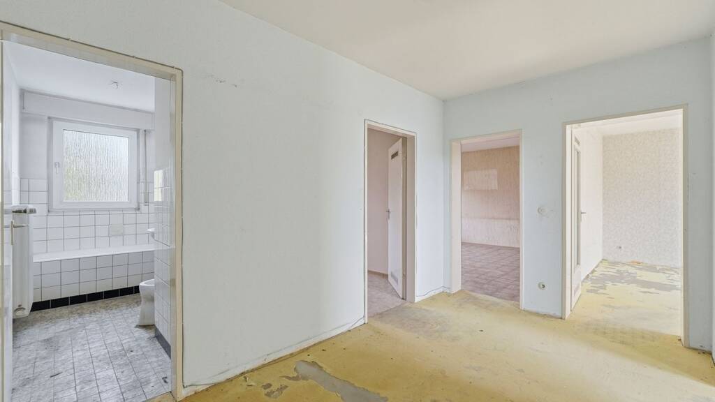 Die Wohnung ist sanierungsbedürftig. Der alte Teppich und die Küche wurden bereits entfernt. Die Visualisierungen stellen dabei ein unverbindliches Beispiel für die Gestaltung nach einer Sanierung.