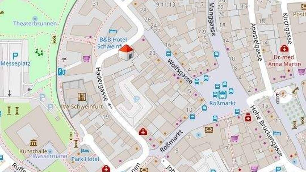 Die Hadergasse selbst ist als verkehrsberuhigte Einbahnstraße mit beidseitigen Gehwegen ausgebildet und ermöglicht eine gute fußläufige Erreichbarkeit. Zentrale Versorgungseinrichtungen, öffentliche Institutionen sowie weitere innerstädtische Angebote befinden sich in direkter Umgebung. Der öffentliche Personennahverkehr ist über nahegelegene Bushaltestellen sowie den Bahnhof Schweinfurt-Mitte komfortabel angebunden; ergänzend stehen in der Innenstadt mehrere Parkmöglichkeiten und Parkhäuser zur Verfügung.