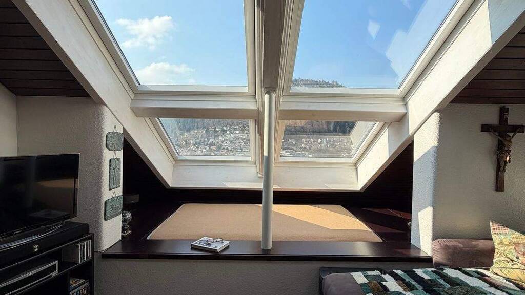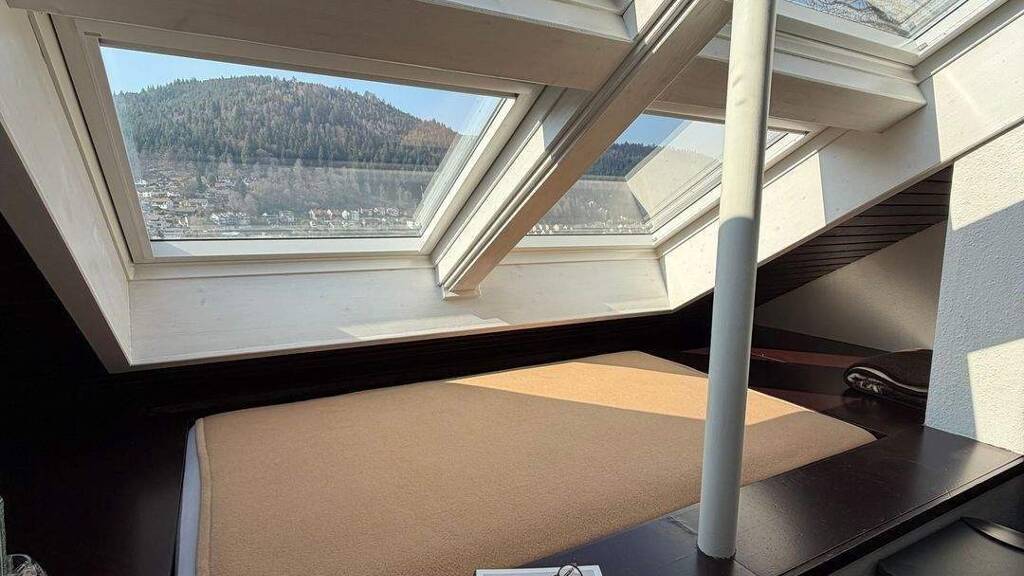 Das Wohnzimmer überzeugt mit sechs neuen Dachfenstern, die einen beeindruckenden Ausblick über Bad Wildbad und auf den Sommerberg ermöglichen. Durch die Vielzahl an Fenstern entsteht eine helle und freundliche Wohnatmosphäre. Unter den modernen Panoramafenstern bietet sich Platz für ein Gästebett oder alternativ eine gemütliche Lese- bzw. Entspannungsecke.