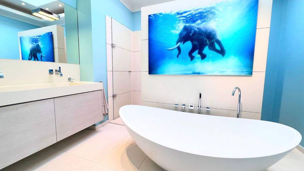 Das Hauptbadezimmer ist als großzügiges En-suite-Bad gestaltet und überzeugt durch eine elegante, zeitlose Ausstattung. Eine freistehende Badewanne bildet den stilvollen Mittelpunkt und lädt zum Entspannen ein.