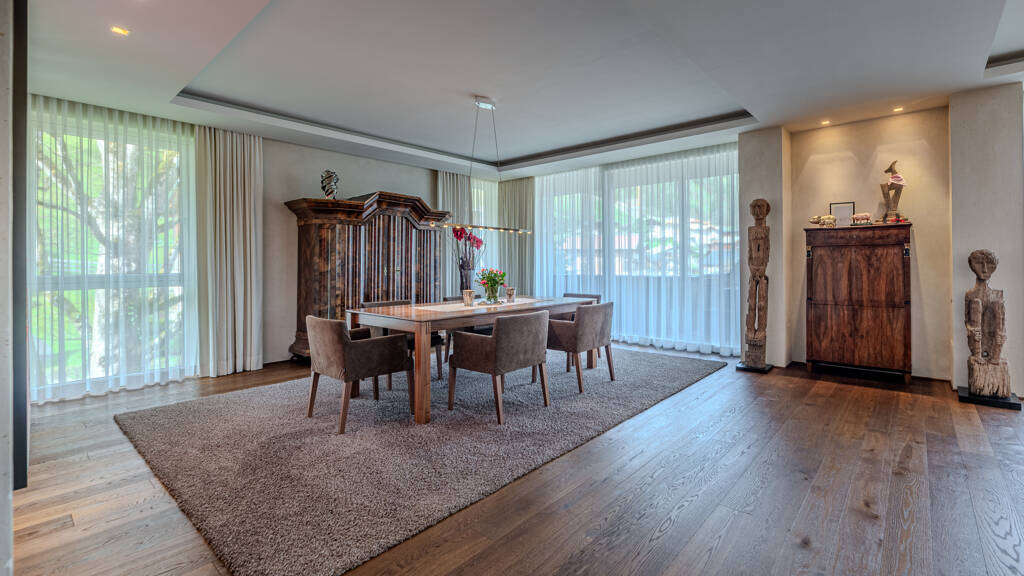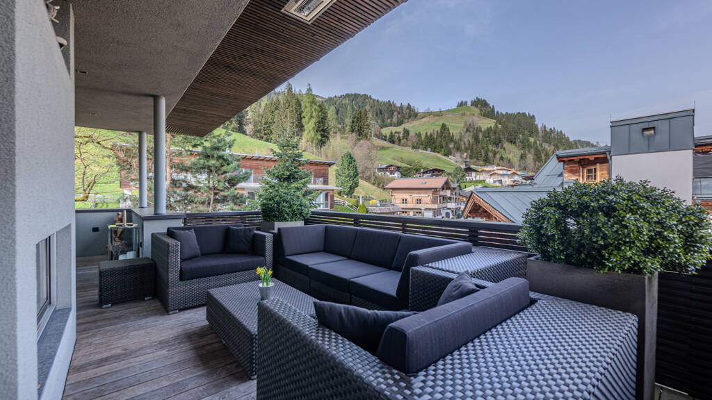 Bei dieser hier angebotenen Liegenschaft handelt es sich um ein wunderbares Apartment in bester Lage von Kitzbühel, am Fuße des Hahnenkamms. Eingebettet in eine repräsentative Nachbarschaft gibt dieses Wohnjuwel einen Blick auf die Tiroler Bergwelt und Kitzbühel frei, der Sie Sommer wie Winter schlichtweg begeistern wird. Bei dieser wunderbaren Immobilie muss der zukünftige Eigentümer verstehen, wie besonders dieser Platz ist und welch ein Gesamtkunstwerk hier entstanden ist. Es handelt sich dabei wirklich um eine Perle, um ein Juwel, welches über die Jahre hinweg noch deutlich an Wert dazugewinnen wird. Es wird bereits beim Betrachten der Außenfassade deutlich, dass hier Wert auf höchste Qualität und modernste Standards gelegt wurde. Geschickt aufgeteilt über drei Etagen vermittelt das stimmige und wohldurchdachte Wohnkonzept ein "Haus-im-Haus"-Gefühl. Die so verteilten nahezu 300 Quadratmeter Wohnnutzfläche bieten Raum für Rückzugsorte, sofern man diese auch beanspruchen möchte. Licht- und sonnendurchflutet durch zahlreiche Terrassentüren, Fensterfronten und Fixverglasungen präsentiert sich das Obergeschoß. Der Ausblick wird nochmals getoppt, sobald Sie auf der Süd-West- beziehungsweise Nord-Ost-Terrasse angelangt sind. Die Stadt liegt einem zu Füßen, der Bergblick ist schier atemberaubend. Man wird förmlich zum Verweilen eingeladen. Das Einrichtungskonzept ist ausgesprochen stimmig und zieht sich wie ein roter Faden durch die gesamte Immobilie und die dabei verwendeten Möbel und Materialien sind von höchster Güte und Qualität. Ein einheimisches namhaftes Innenarchitekturbüro zeichnete sich dafür verantwortlich. Die recht offen gestaltete Küche erfreut Profi- und Hobbyköche gleichermaßen. Der knapp 60 Quadratmeter große Wohn- /Essbereich besticht durch Eleganz und Stil. Man fühlt sich auf Anhieb wohl und zu Hause angekommen. Der Masterbereich mit eigenem Badezimmer und Schrankraum ist mehr als großzügig angelegt und erfreut seine künftigen Eigentümer mit einem direkten Zugang zur Terrasse, beziehungsweise zum Balkon. Ein weiterer Garderobenbereich und eine Gästetoilette runden das Wohnerlebnis auf der obersten Etage würdig ab. Im Gartengeschoß beinhaltet das wohlüberlegte Wohnkonzept einen weiteren Wohnbereich, ein Büro, eine Gästesuite mit Bad, eine Garderobe und einen Abstellraum. Der dazugehörige, sehr pflegeleicht angelegte Garten ist mehr als nur ein Garten, es ist ein Stück Kitzbühel. In der unteren, ebenfalls lichtdurchfluteten Etage werden noch ein Wohnzimmer, ein Schlafzimmer, der Wellnessbereich und ein Schrankraum mit Technikraum beheimatet. In solchen, unwiederbringlichen Toplagen hat Kitzbühel all' seine Immobilieneigentümer stets mit konstanten Wertsteigerungen verwöhnt. Vieles deutet auch in Zeiten wie diesen darauf hin, dass sich diese Entwicklung auch fortführen wird, was Kitzbühel nach wie vor zu einem sehr geschätzten "sicheren Hafen" in Sachen nachhaltiger Immobilieninvestition macht.