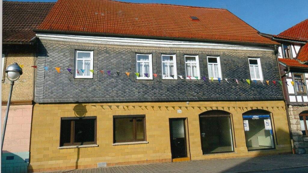 Im Jahre 1880 wurde für einen Handwerksbetrieb das Wohn- und Geschäftshaus in Fachwerkbauweise errichtet und zusätzlich ein größeres Werkstattgebäude, das an einem hinteren Zufahrtsweg anliegt. Das Wohnhaus und die Gewerberäume wurde bis 1978 baulich erweitert und nach 1990 umfangreich in allen Gewerken modernisiert. Das Wohn- u. Gewerbegrundstück hat eine Fläche von ca. 800 m², im OG befinden sich 2 3RW mit Küche, Bad und Wirtschaftsräumen, im EG eine 2Raum-Einliegerwohnung, Gesamtwohnfläche ca. 256 m². Hinter dem Wohnhaus befindet sich ein überdachter Innenhof, der auch als Wintergarten oder Partyraum genutzt werden kann. Zu diesem Innenhof gehören ein WC und kleines Büro. Auf der rechten Seite des EG gibt es ein größeres modernisiertes Ladengeschäft für eine vielseitige gewerbliche Nutzung. Die linke im OG noch bewohnte 3RW hat ein wunderschönes großes Bad und ein sehr anspruchsvolles großes Wohnzimmer. 1880 wurde gemeinsam mit dem WH ein großes Werkstattgebäude errichtet, indem sich über eine lange Zeit eine Heizung-Sanitär-Klempner-Firma befand, heute aber für eine andere gewerbliche Nutzung zur Verfügung steht. Das ganze Wohn- u. Geschäftshaus wird durch eine moderne Buderus-Ölzentralheizung beheizt. Ein Erdgasanschluss ist zusätzlich vorhanden. Hinter dem Wohn- und Geschäftshaus befindet sich ein kleiner Gewerbehof mit kleinen Gewerbehallen und Garagen. Zu diesem Gewerbehof gibt es einen gemeinschaftlichen Zufahrtsweg.