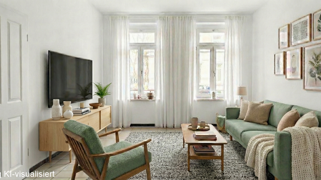 Hinweis zu den Bildern: Die möblierten Abbildungen sind KI-Visualisierungen und dienen lediglich als Einrichtungsbeispiele. Die Wohnung wird unmöbliert und ohne Einbauküche vermietet.