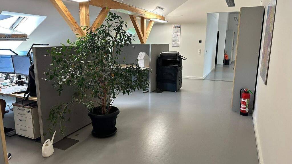 Die Fläche gliedert sich in großzügige, offen gestaltete Bereiche sowie mehrere abgetrennte Büros und Besprechungsräume – ideal geeignet für Agenturen, Kanzleien, Beratungen oder kreative Arbeitskonzepte. Große Fenster und sichtbare Dachbalken sorgen für eine besondere Raumwirkung mit viel Tageslicht und Atmosphäre.
