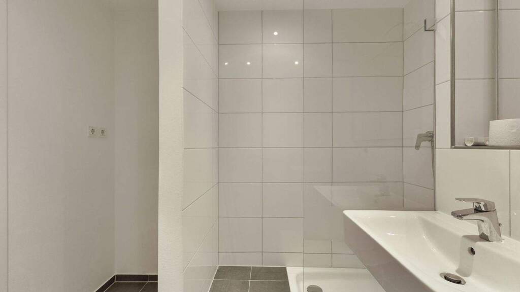 Das modern ausgestattete Badezimmer verfügt über eine separate Dusche sowie einen Waschmaschinenanschluss.