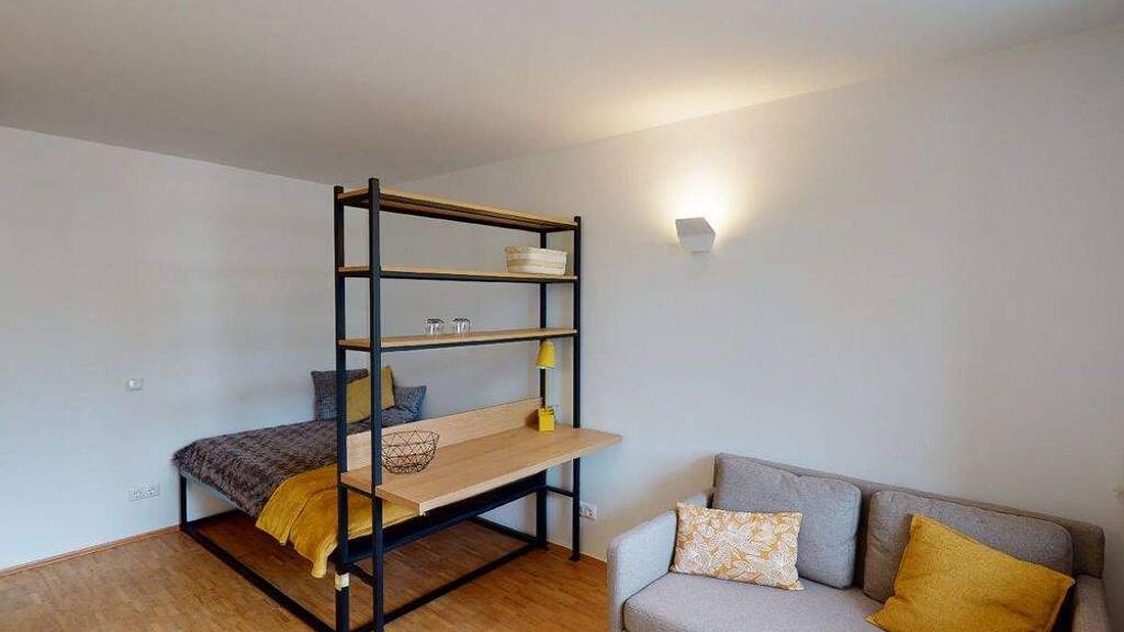 Auf jeder der 11 Etagen verfügbar, bietet die 1-Zimmer-Studio-Wohnung auf rund 26 m2 ein kompakt geschnittenes, wohnlich möbliertes und effizient nutzbares Zuhause, in dem man weder auf Komfort noch auf Design verzichten muss. Vom Eingangsbereich gelangt man in Bad und Wohnbereich, an den eine separate Küche angrenzt. Der Balkon ist vom Wohnzimmer aus begehbar. Ausgestattet mit hochwertigen Küchenmöbeln, Schränken, Bett, Sofa, Esstisch und Arbeitsbereich ist das Apartment die perfekte Kombination für Singles und Studenten, die mehr wollen als nur einen Platz zum Schlafen.
