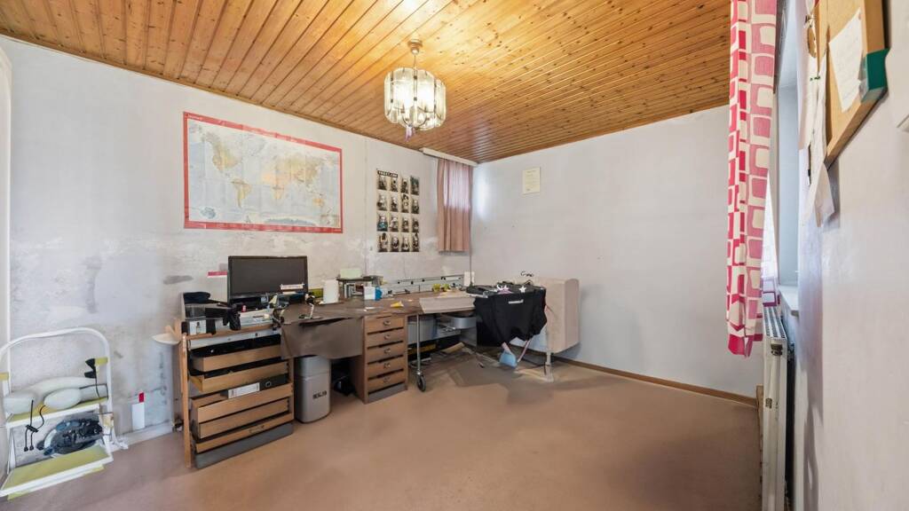 Im Obergeschoss befinden sich der Eingangsbereich, das Esszimmer mit Küche, das Wohnzimmer, zwei Schlafzimmer, ein Badezimmer, eine separate Toilette sowie ein weiteres Kabinett in einem später errichteten Zubau. Vom Eingangsbereich aus gelangt man direkt auf die sonnige Terrasse. Die Fenster sind aus PVC und zweifach verglast. Beheizt wird die Immobilie mittels Gas-Zentralheizung. Das Haus befindet sich in einem baulich soliden Zustand, bedarf jedoch einer Modernisierung, um den heutigen technischen und optischen Standards zu entsprechen.