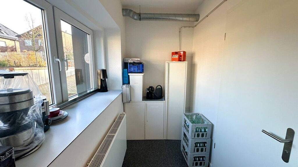 Die Diele, aktuell als Garderobe genutzt, verbindet den Hauptbüroraum mit weiteren Besprechungsräumen, den WC-Anlagen sowie der Küche. Durch die durchdachte Raumaufteilung entstehen kurze Wege und ein funktionaler Kreislauf, der eine flexible Nutzung des gesamten Objekts ermöglicht.