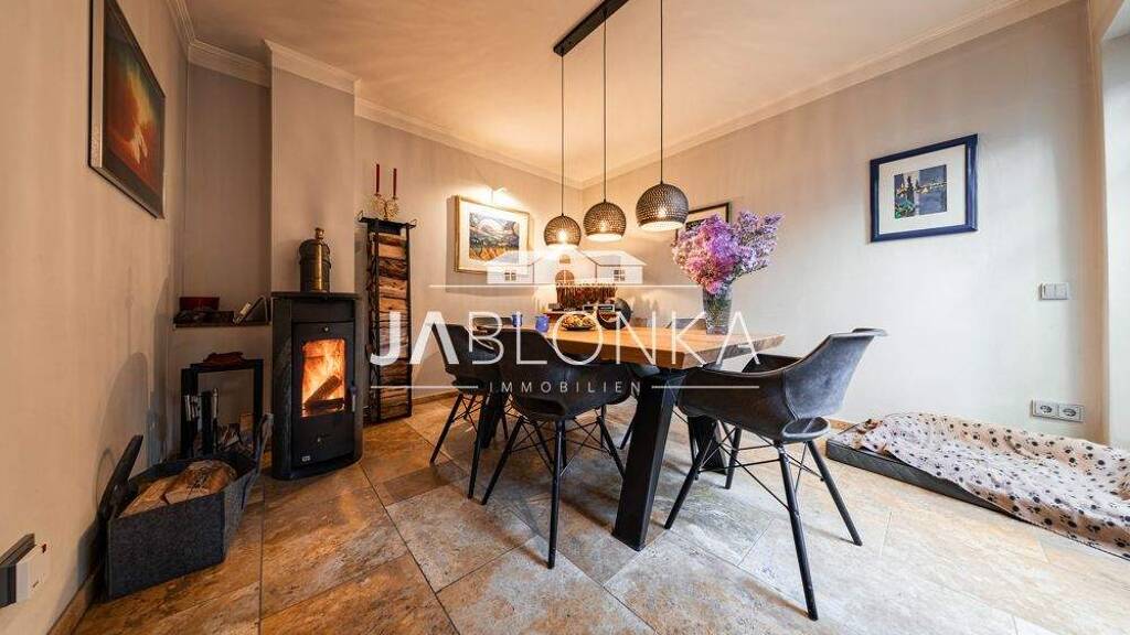 Auf rund 113 m² Wohnfläche erwartet Sie ein durchdachter Grundriss mit klarer Raumaufteilung und feinen Details. Bereits im Erdgeschoss zeigt sich der besondere Charakter des Hauses. Neben einem Gäste-WC und einem praktischen Arbeitszimmer bildet der Wohn- und Essbereich das Herzstück der Immobilie. Ein Kamin sorgt hier für behagliche Wärme, während der direkte Zugang in den Garten das Wohnen harmonisch nach draußen erweitert. Die hochwertige Küche fügt sich stimmig in das Raumkonzept ein und bietet den passenden Rahmen für Genuss und Alltag.