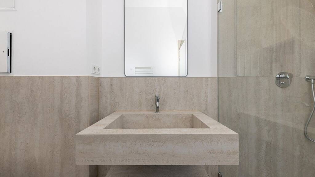 Exklusive Ausstattung: Hochwertige Materialien wie Natursteinfliesen und Fischgrätenparkett aus heller Eiche setzen luxuriöse Akzente.