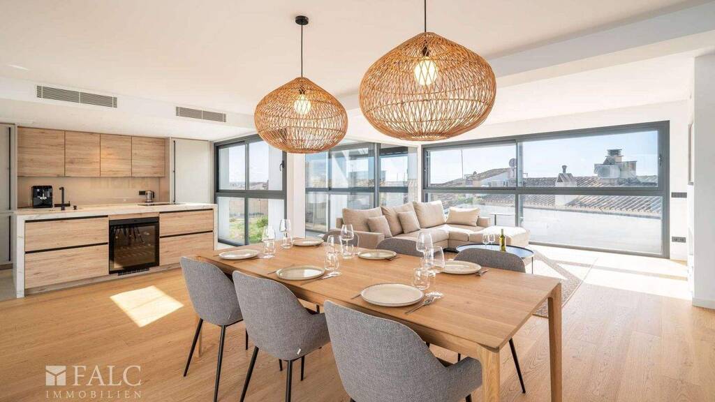 Bereits beim Betreten der Wohnung überzeugt das Penthouse durch seine großzügige Raumwirkung, klare Linien und eine lichtdurchflutete Architektur. Der offen gestaltete Wohnbereich mit Kamin bildet das Herzstück der Immobilie. Große Fensterfronten schaffen fließende Übergänge zwischen Innen- und Außenraum und eröffnen spektakuläre Blicke auf das Meer, Palma und die Kirche von El Molinar. Hochwertige Materialien, edle Holzoberflächen und moderne Glaselemente verleihen dem Wohnraum eine elegante und zugleich warme Atmosphäre.