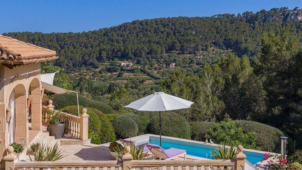Die Villa hat ein weitl?ufiges Grundst?ck, darunter gepflegte G?rten mit einheimischen Pflanzen und B?umen, zahlreiche Terrassen und einen neu gefliesten Pool mit Liegewiese und Blick auf das Tal.
