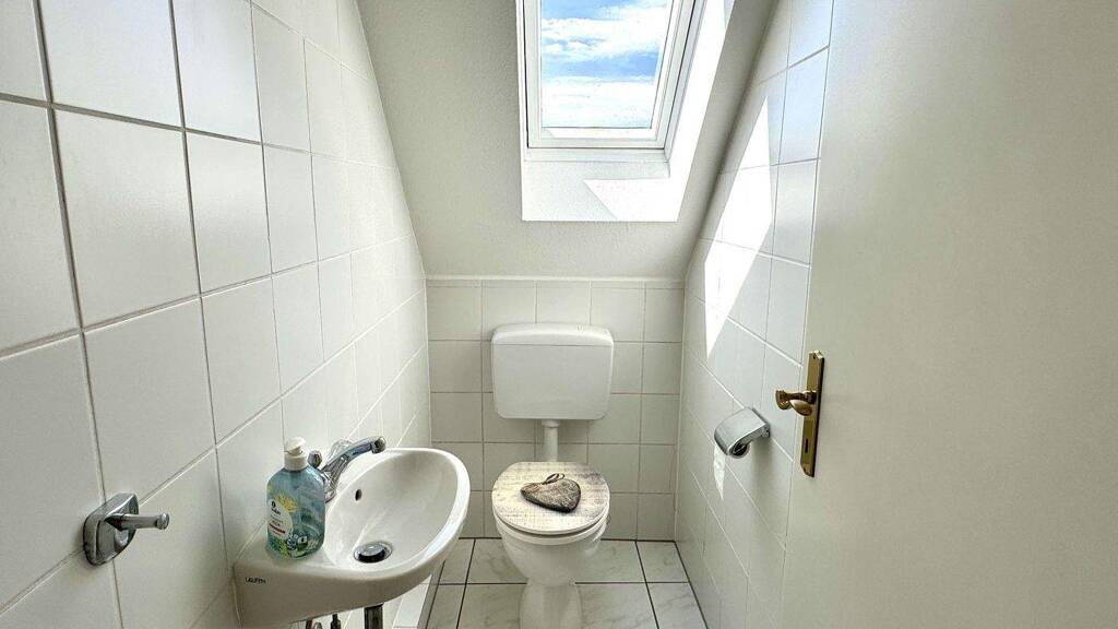 Das moderne Tageslichtbad mit Dusche und Badewanne überzeugt mit einer funktionalen Ausstattung und sorgt für ein angenehmes Wohlfühlambiente. Zusätzlich gibt es ein separates Gäste-WC, das den Komfort der Wohnung abrundet.