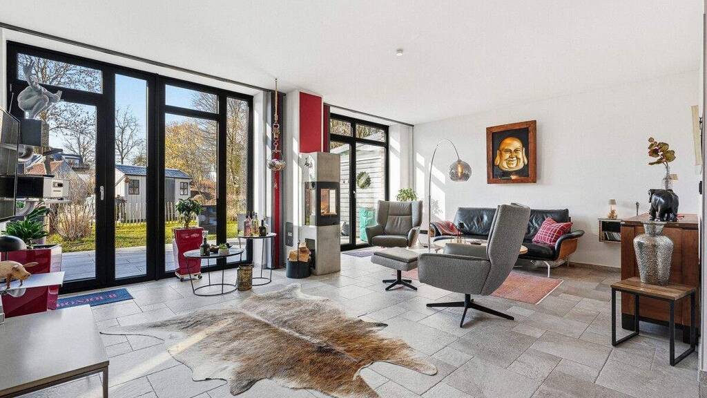 Der offene Wohn- und Küchenbereich mit Kaminofen bildet das Herz des Hauses. Große Fensterfronten sorgen für viel Licht und einen schönen Blick in den Garten - ein Ort zum Ankommen und Genießen.