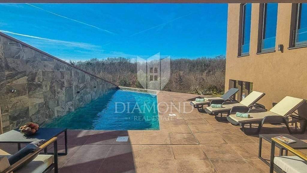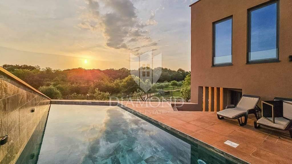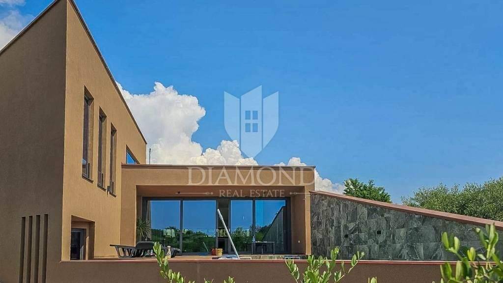 Novigrad, eine moderne Designvilla von 136 m² auf einem Grundstück von 925 m² mit drei Schlafzimmern, einem Swimmingpool und Meerblick, befindet sich in der Nähe der Stadt Novigrad, nur 2,5 km vom Zentrum und wunderschönen Stränden entfernt.