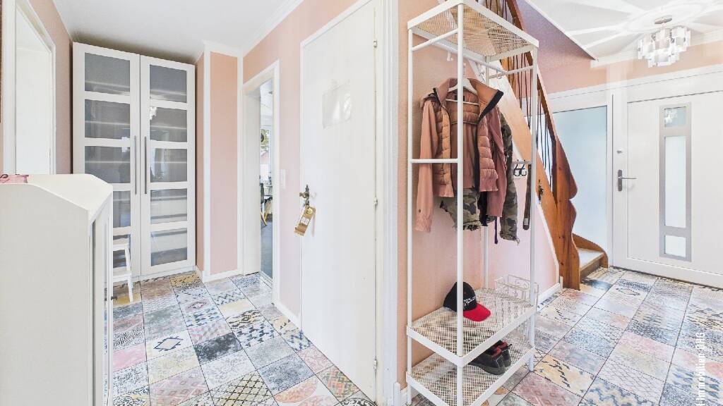 Das Haus verfügt über einen überdachten Außeneingangsbereich, der viel Platz für z.B. einen Kinderwagen, ein Laufrad oder Dekoration bietet und Sie trocken ankommen lässt. Beim Betreten des Hauses entdecken Sie gleich auf den ersten Blick die individuelle und sehr stylische Note des Hauses. So geht es auch in der hochmodernen Küche weiter, die ein absolutes Highlight für den ambitionierten Hobbykoch ist. Hier bleiben durch die vielen Einbauschränke und dem professionellen Gasherd, mit gleich sieben Kochfeldern und drei Öfen, keine Wünsche offen. Ein Esszimmer mit Zugang zur großen Terrasse, die teilweise überdacht ist, ein separates Wohnzimmer, das neue Duschbad und ein Gästezimmer runden dieses Stockwerk ab.