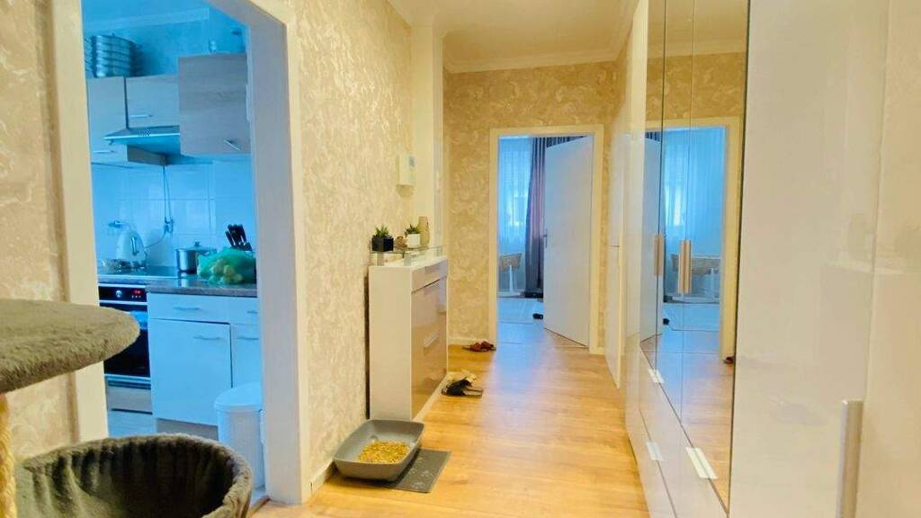 Die Wohnung empfängt Sie mit einem offenen, geräumigen Wohnungsflur. Hier finden Sie viel Platz für eine Garderobe und weitere Möbel zur Aufbewahrung. Im Flur befindet sich auch ein praktischer, offener Abstellbereich (derzeit befindet sich hier ein großer Kleiderschrank). Durch den Wohnungsflur erreichen Sie alle Zimmer dieser Wohnung. Die Arbeitsküche bietet Ihnen Platz für eine Küchenzeile und einen Esstisch sowie weiteren Küchen-Arbeitsbereich. Das Schlafzimmer beherbergt Raum für ein großes Doppelbett oder zwei Einzelbetten und einen geräumigen Kleiderschrank.