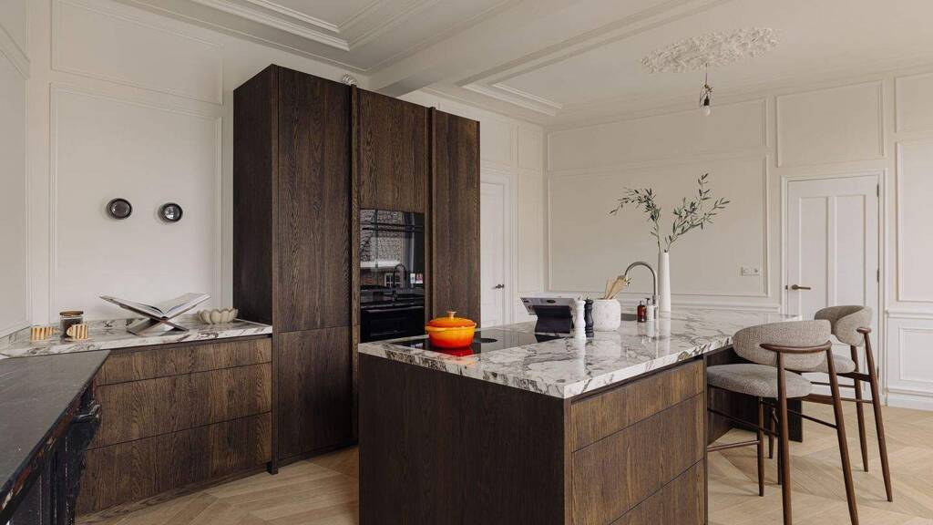 the monumental staircase leads to the landing of the first floor. at the rear is the classic dining room with access to a second internal balcony. this balcony features a folding glass façade, seamlessly connecting indoor and outdoor living. thanks to its favourable position, you can enjoy the sun here well into the evening. at the front is the spacious kitchen-diner with cooking island-without doubt the centrepiece of the home. the kitchen is finished in beautiful dark oak and complemented by an elegant composite worktop. it is equipped with high-end siemens studioline appliances, a bora cooktop, and a quooker tap. the island also features a welcoming bar area. with a width of nearly 7 metres and three large windows, the kitchen enjoys wonderful open views towards jan luijkenstraat. from both the kitchen and the landing, the fourth (bed)room can be accessed, which is ideal as a home office or study.