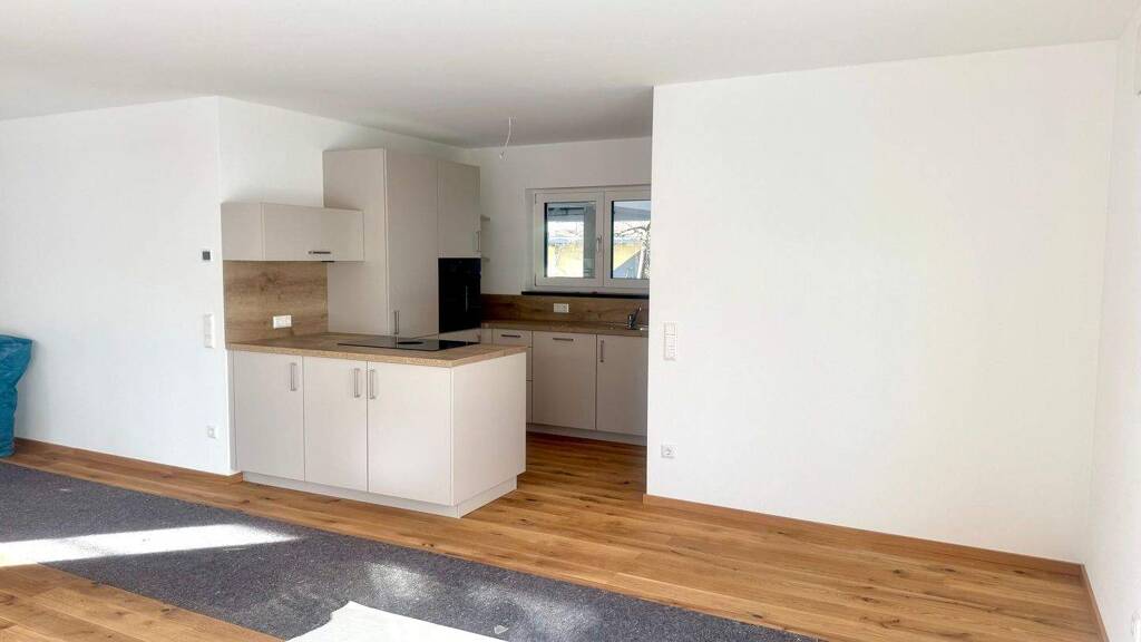 Im Inneren erwartet Sie ein großzügiger, offen geschnittener Bereich für Kochen und Essen oder Wohnen. Eine Einbauküche ist bereits inkl. Elektrogeräten im Mietpreis enthalten. Ein praktischer Abstellraum direkt neben der Küche bieten zusätzlichen Komfort. Direkt nebenan befindet sich ein halb abgetrenntes weiteres Zimmer, welches wunderbar als Wohnzimmer oder Esszimmer genutzt werden kann. Das weitere Schlafzimmer ist geräumig und hell. Der Flur verbindet alle Räume sinnvoll in der Mitte und schafft zusätzlichen Stauraum. Im Tageslichtbadezimmer befindet sich neben einer Badewanne ebenso eine moderne, ebenerdige Regendusche. Absolutes Highlight ist die rund 30 m² große Terrasse, welche teilweise überdacht ist und noch eingezäunt und gepflastert wird.