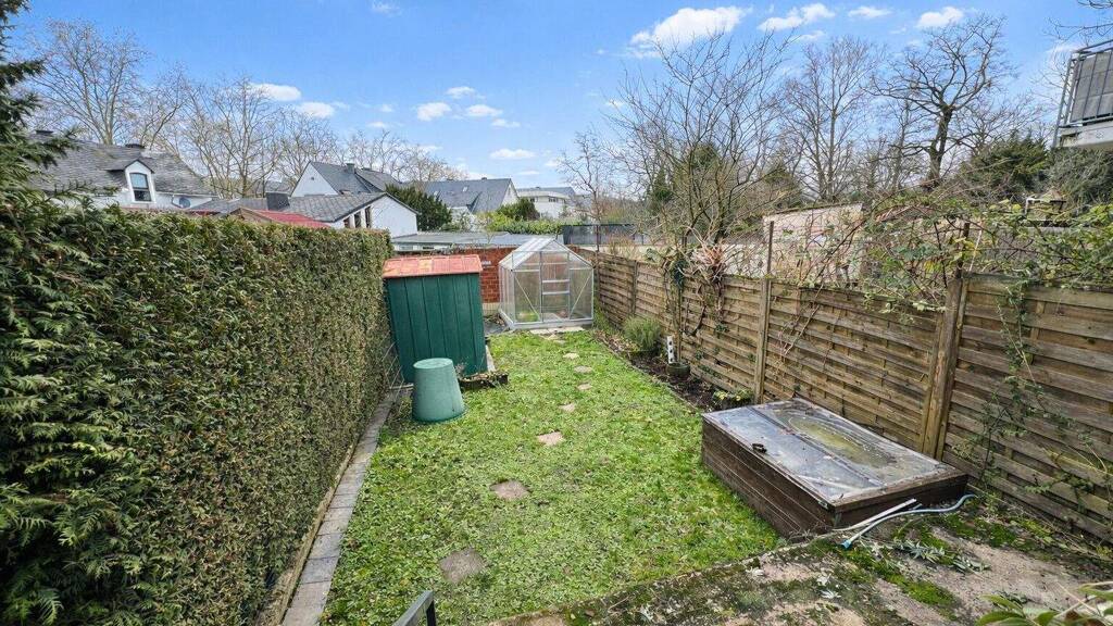 Ebenfalls von der Küche aus erreichen Sie die überdachte Terrasse mit großzügiger Fläche, die zum Verweilen einlädt. Von hier führt eine kleine Treppe in den gemütlichen Garten, der nach hinten und rechts eingefriedet ist und links durch Begrünung abgeschlossen wird.