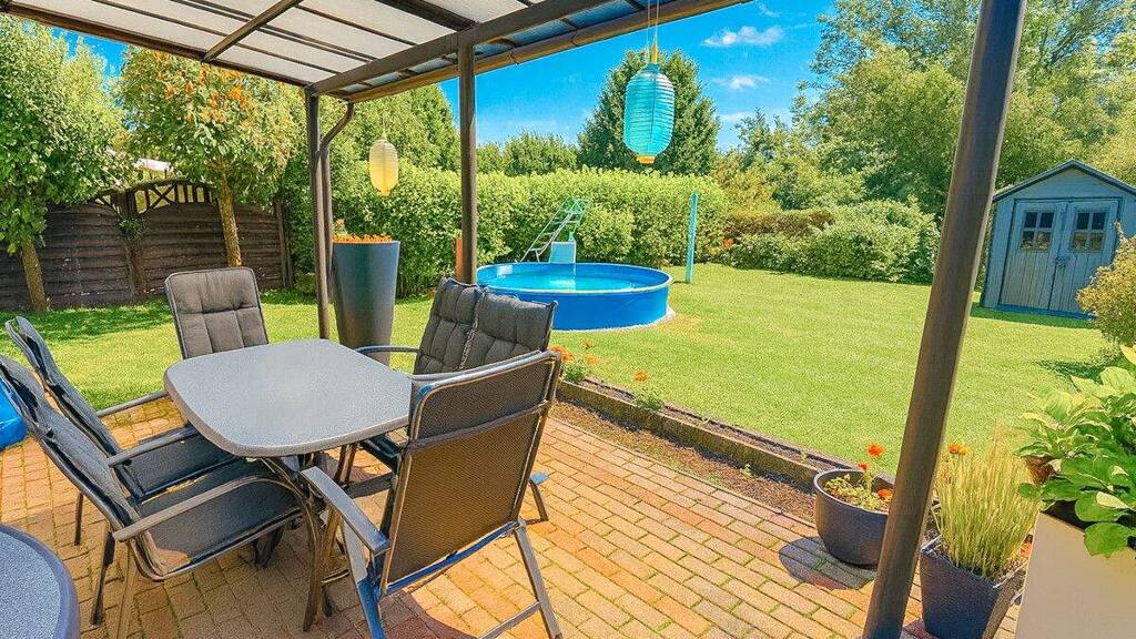 Der Außenbereich unterstreicht den wohnlichen Charakter: Auf rund 336 m² präsentiert sich ein Garten mit natürlicher Begrünung, die Sichtschutz und Atmosphäre zugleich schafft. Ein kleiner Pool sorgt für Abwechslung, der Schuppen bietet nützlichen Stauraum. Die überdachte Terrasse verbindet Haus und Garten zu einem stimmigen Ganzen und schafft einen geschützten Platz im Freien.