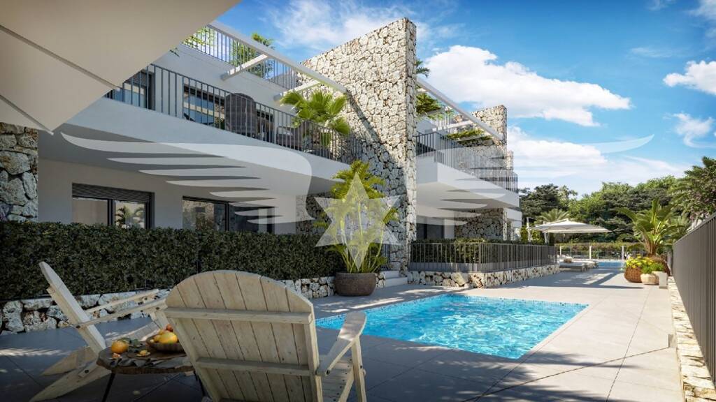 Der Komplex mit einer modernen Architektur verfügt über zwei zweigeschossige Gebäudekörper mit Erdgeschosswohnungen und großzügigen, überdachten Terrassen sowie privaten Gärten. Die Penthouse-Wohnungen bieten von der Meerblick von der Wohnterrasse sowie der Dachterrasse.