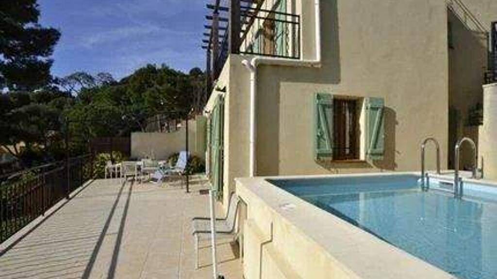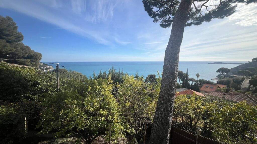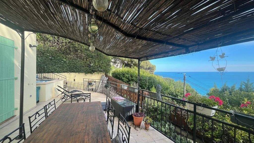 Eze Bord de Mer, in a small co-ownership of 3 residential units, charming semi-detached house of 131 m2, built on 3 levels, offering a beautiful sea view, pleasant terraces, a small garden and a small swimming pool.