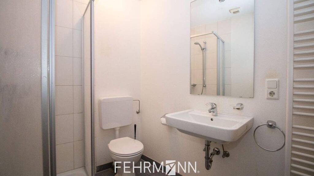 Das hellgeflieste Badezimmer verfügt über eine Dusche sowie einen praktischen Badheizkörper, der für eine angenehme Raumtemperatur sorgt. Zusätzlich steht hier ein Wasch- und Trockenraum zur Verfügung.
