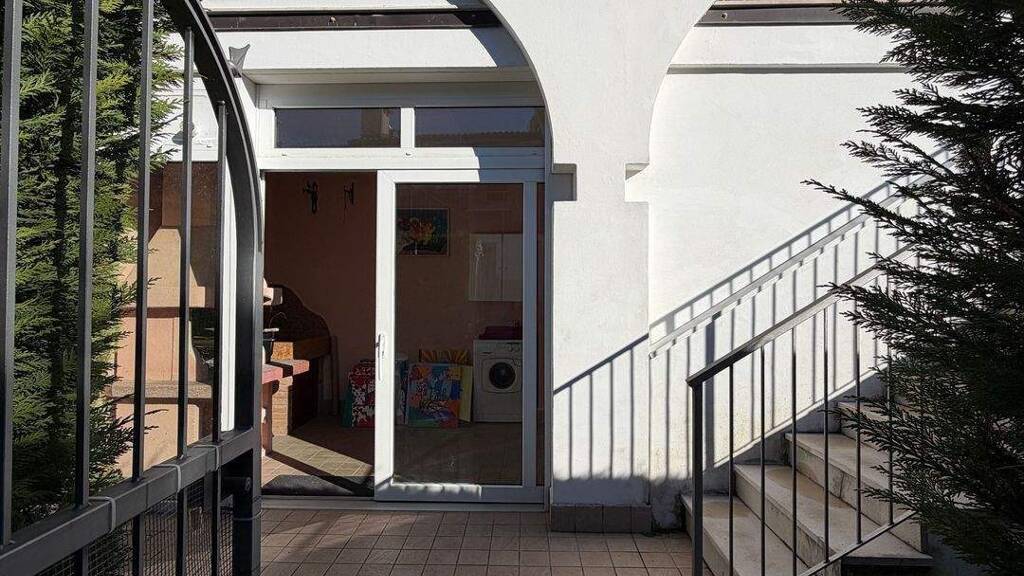 Sie ist über einen separaten Eingang im Erdgeschoss zugänglich, wo sich ein privater Garten und eine verglaste Veranda befinden. Eine Treppe führt hinauf zur hellen Terrasse mit herrlichem Panoramablick. Die Wohnung im ersten Stock besteht aus einem offenen Wohn-/Essbereich mit Küche, zwei Schlafzimmern und einem Badezimmer mit Dusche und Fenster.