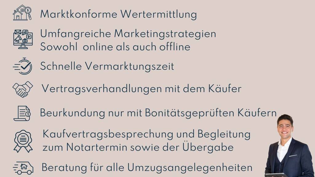 Dem Erwerber berechnen wir im Erfolgsfall eine Nachweis- bzw. Vermittlungsprovision in Höhe von 5.950 € inkl. aktuell gültiger ges. MwSt. aus dem Kaufpreis, fällig bei Abschluss des notariellen Kaufvertrages. Trotz sorgfältiger Prüfung der Angaben im Exposé übernehmen wir keine Haftung für deren Richtigkeit und Vollständigkeit. Sollten wir aktuell kein passendes Objekt für Sie haben, können wir Ihre Suchkriterien zur Unterstützung Ihrer Suche dokumentieren. Gerne verkaufen, vermieten oder verwalten wir auch Ihre Immobilie.