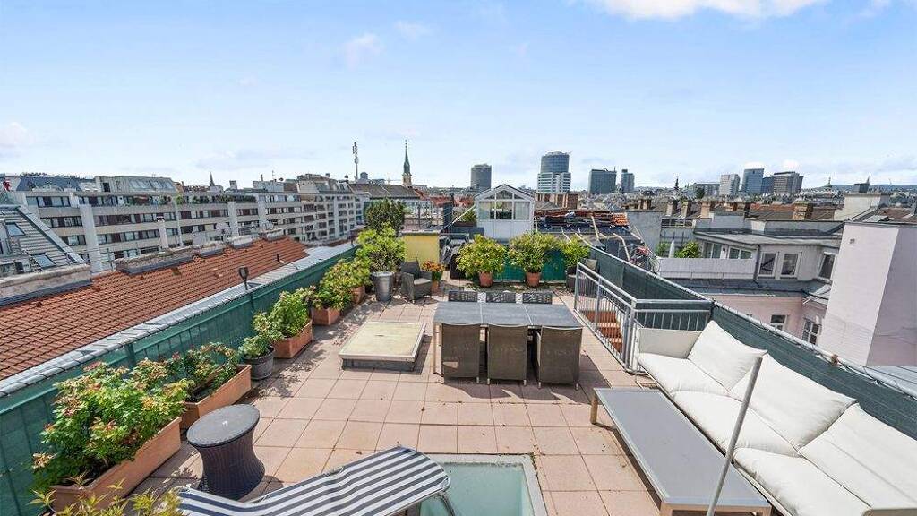 Ein Highlight ist die großzügige Dachterrasse mit Blick über Wien, perfekt zum Entspannen. Klimaanlage, ein Wirtschafts-/Abstellraum und ein KFZ-Stellplatz bieten weiteren Komfort.