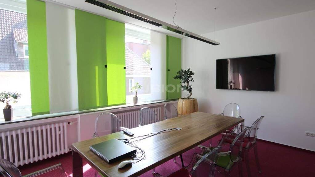 Bodenbelag: Teppich EDV-Verkabelung: CAT 5 Kabelführung: Brüstungskanäle Kühlung: im Besprechungs- und Geschäftsführerraum Sonnenschutz: innen liegend (manuell) Teeküche: vom Vormieter Beleuchtung: Rasterdeckenleuchten Aufzug: Personenaufzug Heizung: Öl-Zentralheizung Barrierearm: ja Achsmaß: 2,20 m Deckenhöhe: 2,82 m Raumtiefe: uneinheitlich Parkplätze: Außenstellplätze Sonstiges: - Brandmeldeanlage - Alarmanlage - automatische Eingangstür - Videoüberwachung