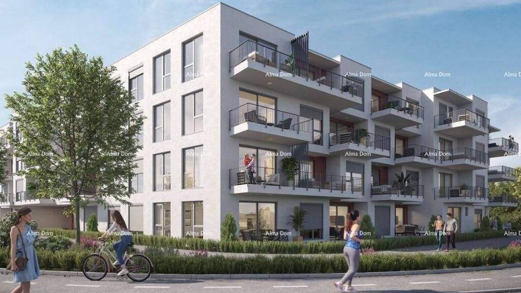 Im Stadt Umag, im Rahmen eines modernen Wohnprojekts mit insgesamt 122 Wohnungen, wird eine Wohnung im 2. Stock eines Wohngebäudes verkauft. Die Wohnung hat eine Gesamtfläche von 53,98 m und die Kennzeichnung 2-28. Sie besteht aus einem Eingangsbereich, einer Küche und einem Wohnzimmer, einem Badezimmer, einem Schlafzimmer sowie einem Balkon mit einer Fläche von 9,98 m.