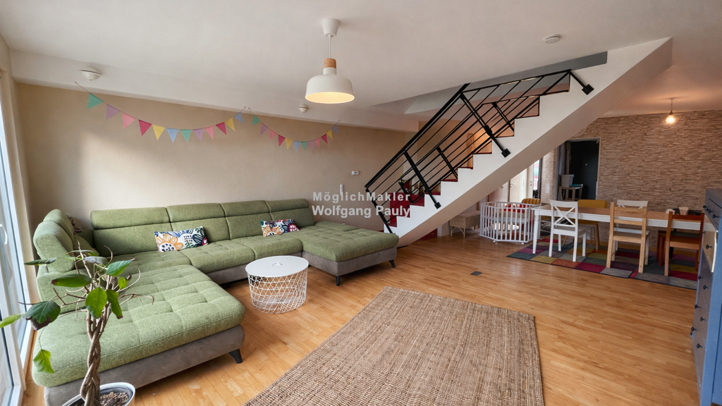 Hell und einladend, genießen Sie den offen gestalteten Wohnbereich mit großer Fensterfront und direktem Gartenzugang. Moderne Treppenanlage mit markantem Metallgeländer als architektonisches Highlight. Ein Haus mit klarer Linie, modernem Wohngefühl und gepflegtem Gesamtzustand. ideal für Familien oder Paare und perfekt geeignet für das Arbeiten im Homeoffice.