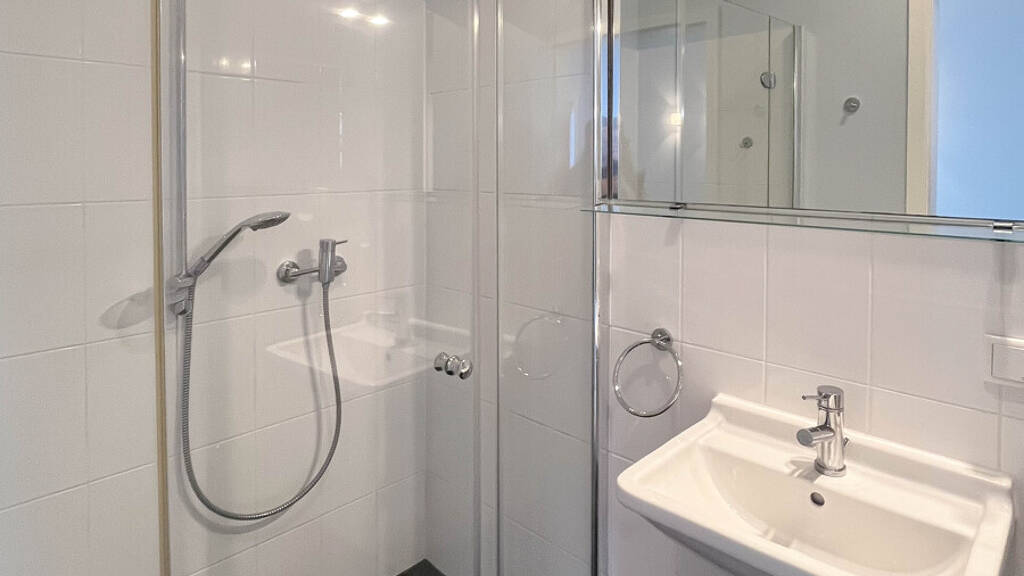 Ein weiteres Badezimmer mit Dusche und WC befindet sich separat und ist vom Flur aus zugänglich.