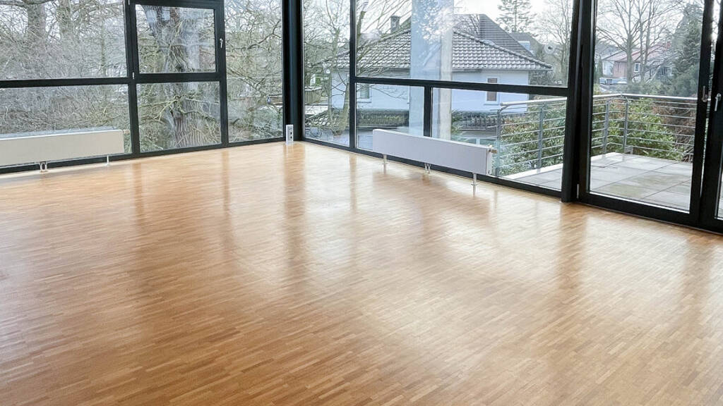 In den Wohnräumen ist Echtholz-Stäbchenparkett verlegt. Küche, Bäder, Eingangsbereich sowie weitere Funktionsbereiche sind mit anthrazitfarbenen Fliesen ausgestattet.