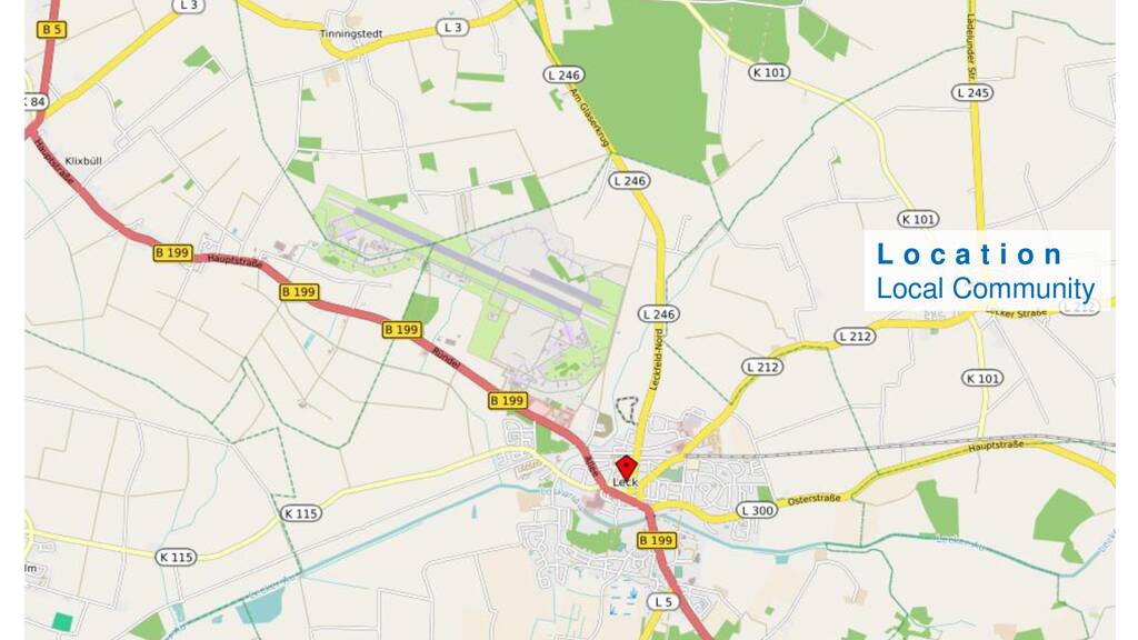 - direkt an der B199, der Hauptverbindungsstraße von Flensburg zur Nordsee - Nordsee ca. 20 km von Leck entfernt - nächstgelegener Bahnhof in Niebüll (ca. 10 Minuten), Zugverkehr Richtung Hamburg und auf die Insel Sylt - A 7 als Anschluss an das Autobahnnetz nach Skandinavien oder Hamburg rund 27 km entfernt (Anschlussstelle Flensburg) - südlich von Leck B 5 (Hauptverbindungsachse in Nord-Süd-Richtung entlang der schleswig-holsteinischen Westküste in Richtung Süden zur A 23) - drei Häfen in unmittelbarer Nähe (Husum, Flensburg, Büsum) sowie zahlreiche Airports (Sylt, HH, FL, Billund (DK)) - Nato-Flugplatz noch heute ein Sonderlandeplatz für den Luftverkehr (inkl. luftfahrtrechtliche Genehmigung) - gute Zugänge zu Hochschulen, Wissenschaftseinrichtungen und Weiterbildungseinrichtungen an der Westküste