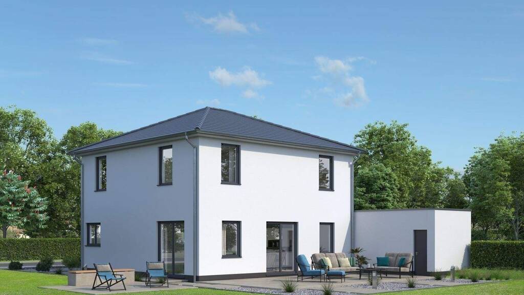 Wer in seinem neuen Zuhause viel Platz und eine optimale Raumaufteilung haben will, wird diese Hausvariante lieben. Es können weitere Fenster und Türen oder auch ein Kamin platziert werden. Der große Wohnbereich schafft einen fließenden Übergang zwischen Essen, Wohnen und Kochen. Hier wird sich der Familienalltag im Haus abspielen. Natürlich bieten auch die Zimmer im Obergeschoß viele Gestaltungsmöglichkeiten. Die zwei großen Kinderzimmer liegen direkt nebeneinander. Spielen, Schlafen oder Hausaufgaben: Alles findet Platz. Sie planen Ihr Haus mit uns nach Ihren Wünschen. In unserer Kalkulation sind bereits enthalten: - KfW 55-Standard - - 3-fach verglaste Fenster mit elektrischen Rollläden - Fußbodenheizung im Erd- und Obergeschoss - Gäste-WC - Bad mit Wanne und bodengleicher Dusche - WC im EG - Abstellfläche im Spitzboden über Einschubtreppe zugänglich - PV-Vorbereitung- Preis inklusive Grundstück, zzgl. Baunebenkosten