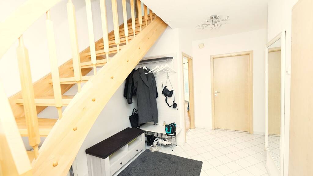 Das Zentrum des Hauses stellt der große Wohn- Essbereich mit offener Küche im Erdgeschoss da. Hinzu kommt ein charmantes Gäste-WC, der Flur mit Treppe und ein ausreichend großer Hauswirtschaftsraum. Hier befindet sich neben der Heizung auch ein Waschmaschinenanschluß und Platz für den Trockner.