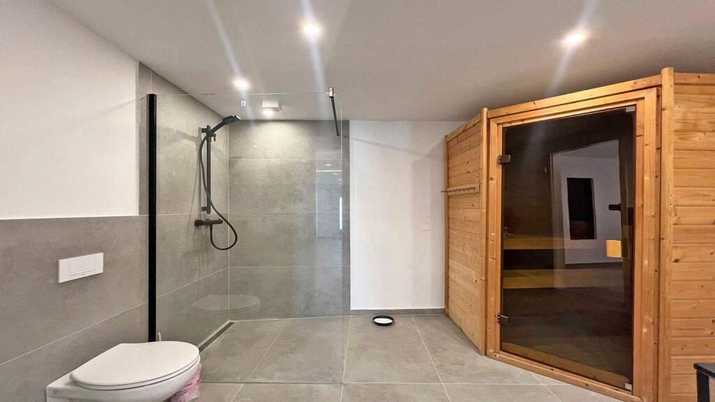 Zurück Richtung Eingangsbereich erreichen Sie über den Hauseingangsflur noch das Gäste-WC, samt integrierter Sauna (im Kaufpreis enthalten).