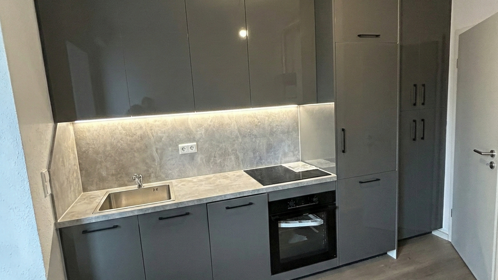 Ein signifikantes Merkmal dieser Wohnung ist das Wohnzimmer, ausgestattet mit einem Panoramafenster, das sich um eine Raumecke erstreckt. Dieses Designelement ermöglicht eine maximale Ausnutzung des natürlichen Lichts und erweitert die visuelle Raumwahrnehmung, indem es den Blick auf die Außenwelt öffnet. Die Fenster, eine Kombination aus Aluminium und Kunststoff, sind nicht nur für ihre ästhetische Qualität bekannt, sondern auch für ihre Effizienz in Wärme- und Schalldämmung, was den Wohnkomfort maßgeblich verbessert.